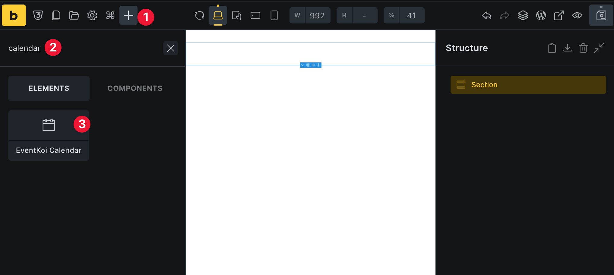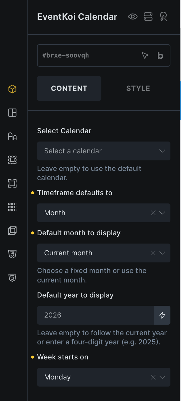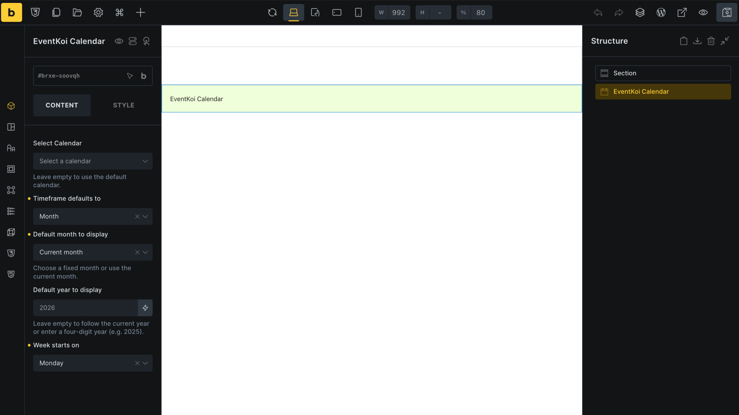 This guide shows how to add and customise the EventKoi Event Calendar element in Bricks Builder. You’ll learn how to insert the calendar, choose which calendar to display, and control its default view and behaviour.