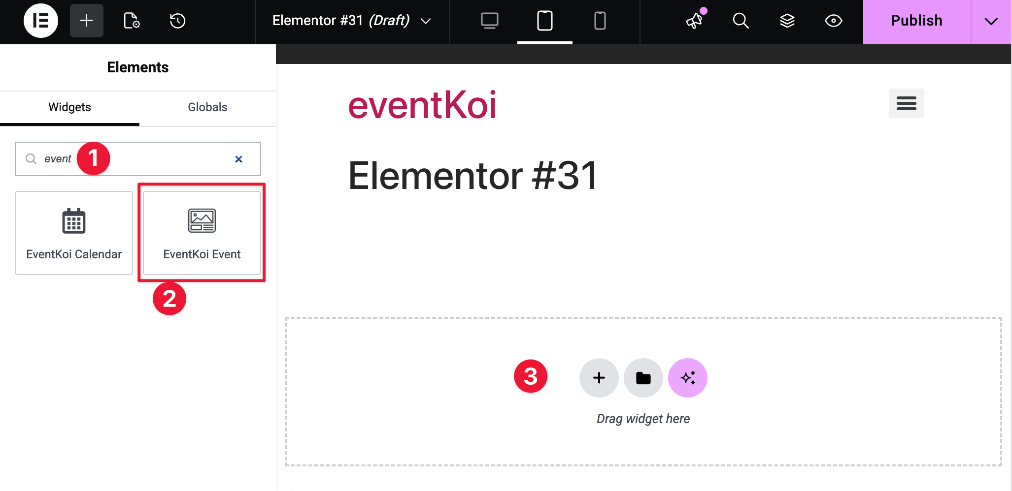 - Search “Event” to find the EventKoi Event widget