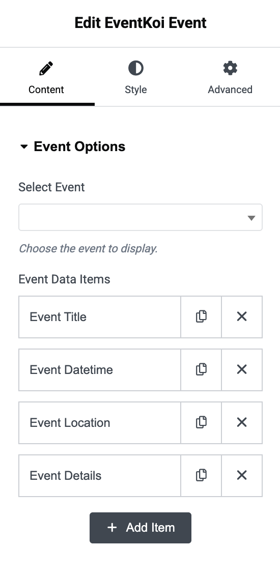 The EventKoi Event Widget lets you display a single event’s details directly within any Elementor-built page or post.