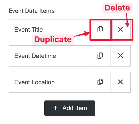 You can Delete and Duplicate items by clicking the icons on the right hand side of each item.
