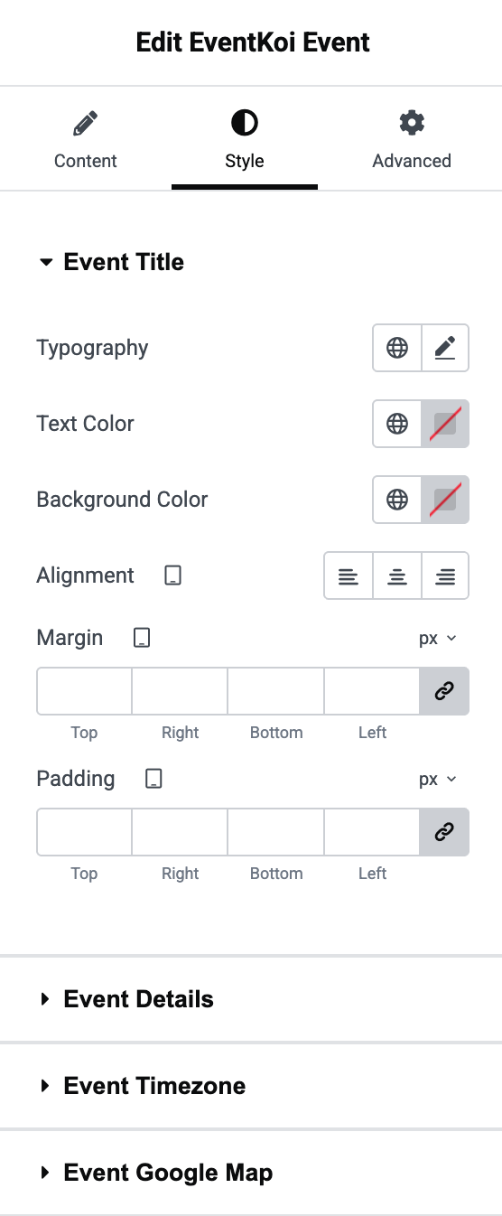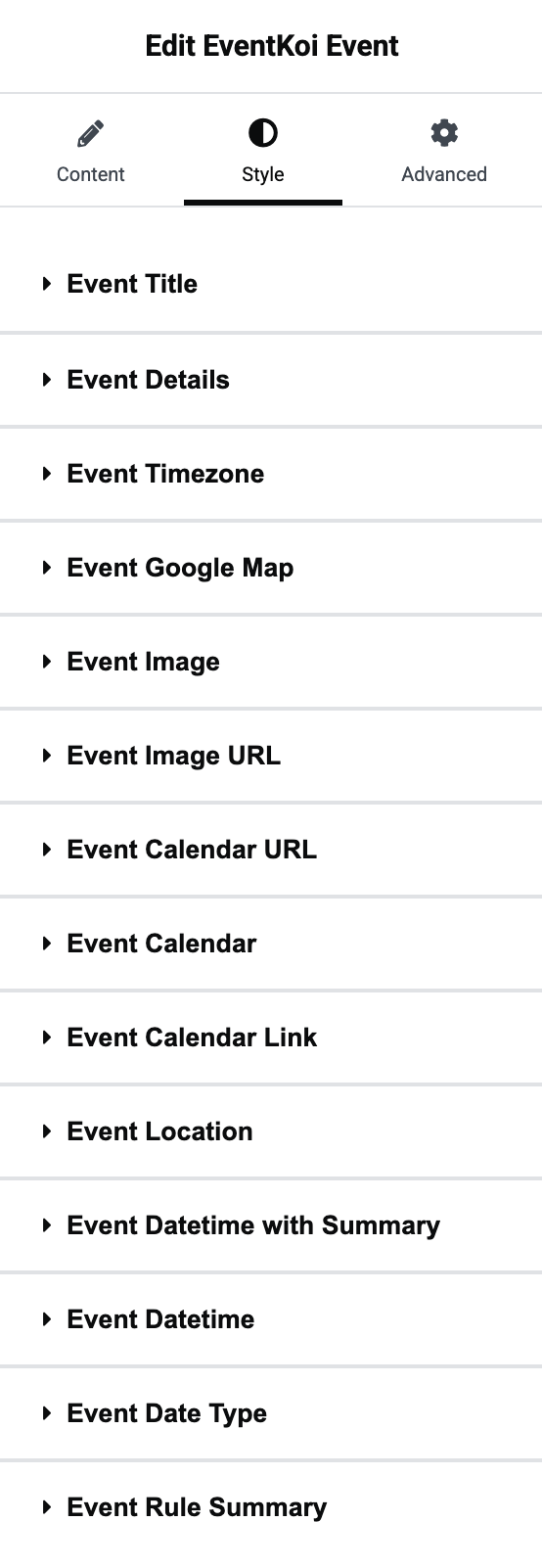 In the EventKoi Event widget’s Style tab, you are given the option to style every available data type. Simply click on the data type you want to style to expand it and start customising.