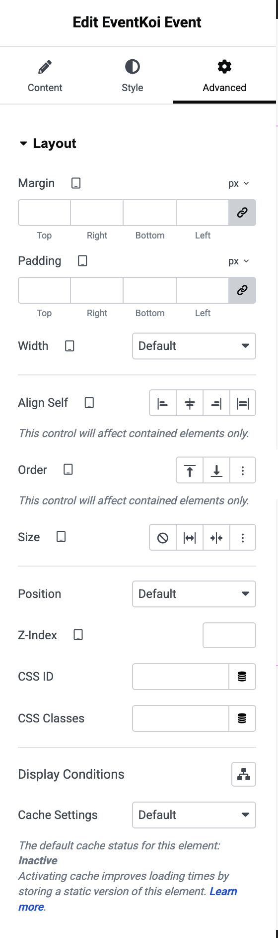 Finally, in the Advanced tab, you will see a variety of Layout options. These are standard in Elementor widgets.